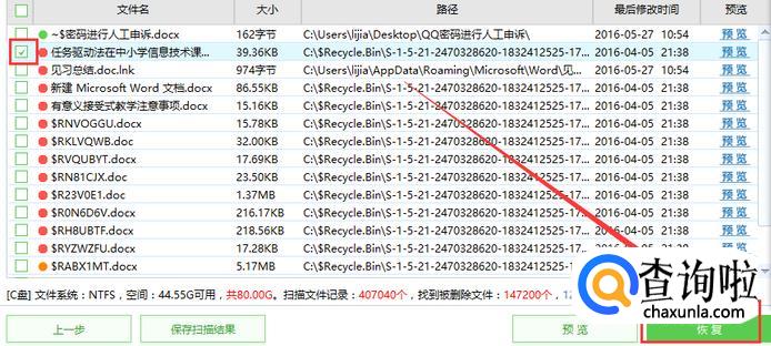 找到要恢复的文件后,先勾选再点击右下角恢复,文件就被恢复啦。