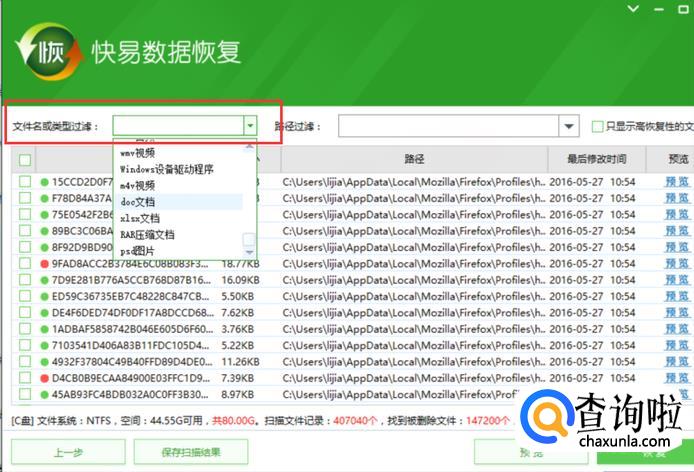 扫描完成后会出现所有被删除的东西,为了减少筛选范围,可以选择误删文件的格式。