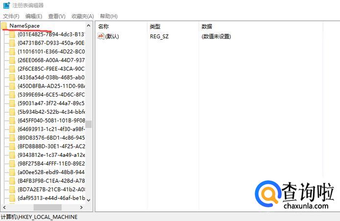 进入后,按照HKEY_LOCAL_MACHIME/SOFTWARE/microsoft/WINDOWS/CURRENTVERSION /EXPLORER/DESKTOP/NemeSpace这个路径,到以下界面。