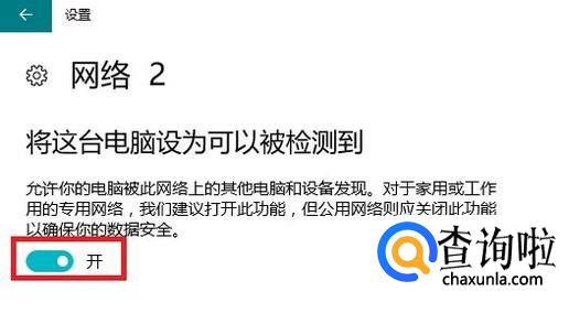 如果将“将这台电脑设为可以被检测到”的开关开启,则代表当前的网络位置为家用或工作用的专用网络;如果将其关闭,则代表当前的网络位置为公用网络。