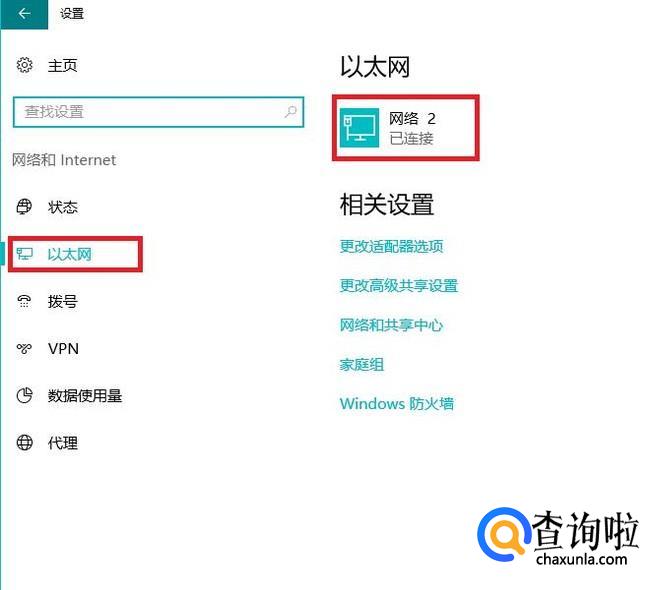 在“网络和Internet”设置的左侧列表中,点击进入“以太网”分组,并点击当前的网络连接。
