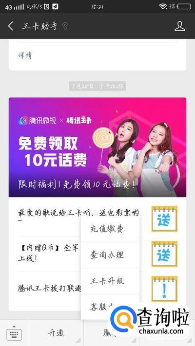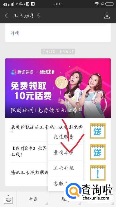 进入王卡助手公众号后,点击最下方的“服务”选项,如图1箭头所示。会出现一个新的界面,如图2所示。