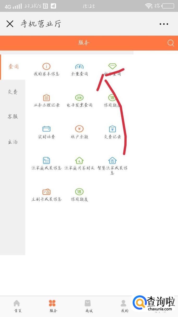点击“查询办理选项”如图1箭头所示。会出现一个新的界面,如图2所示。点击“余量查询”如图3箭头所示。输入手机号码得到随机验证码就可以查询了。