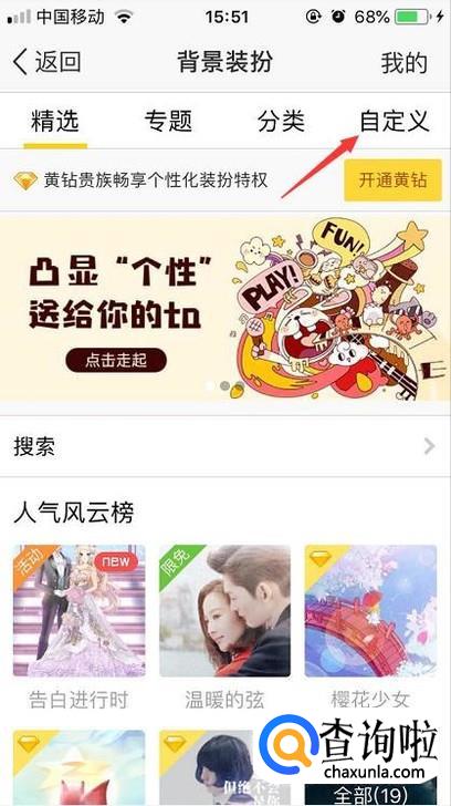 在背景页面的装扮里面我们先点击一下自定义的选项。