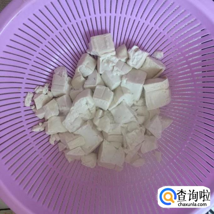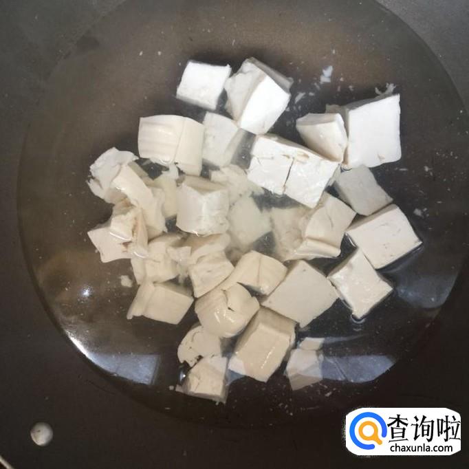 首先将豆腐切成小块,倒入开水中烫一分钟,捞出沥干。