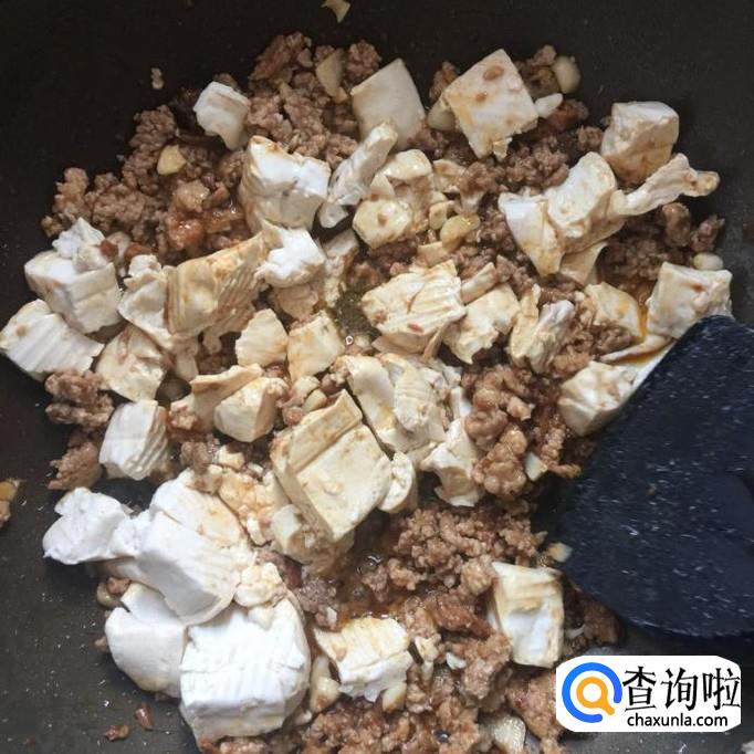 然后把之前烫好的豆腐倒入锅中,翻炒两分钟。