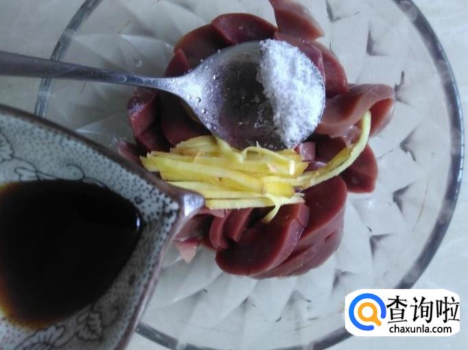 然后切成薄片,加适量的盐、1勺生抽、1勺料酒腌制几分钟。