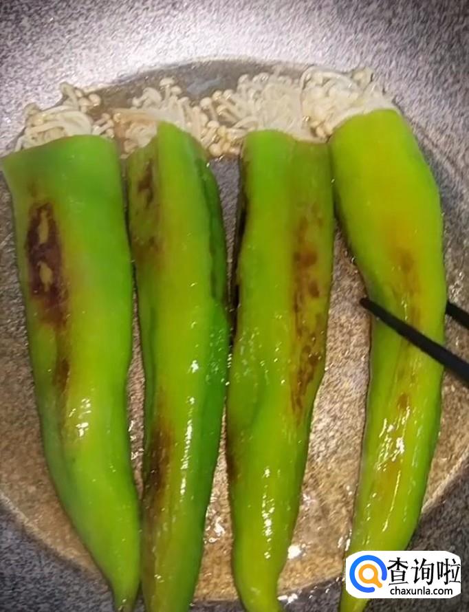 然后我们在锅中烧油,油热放入青椒金针菇,小火把青椒煎至虎皮状,关火