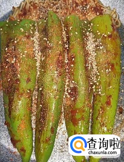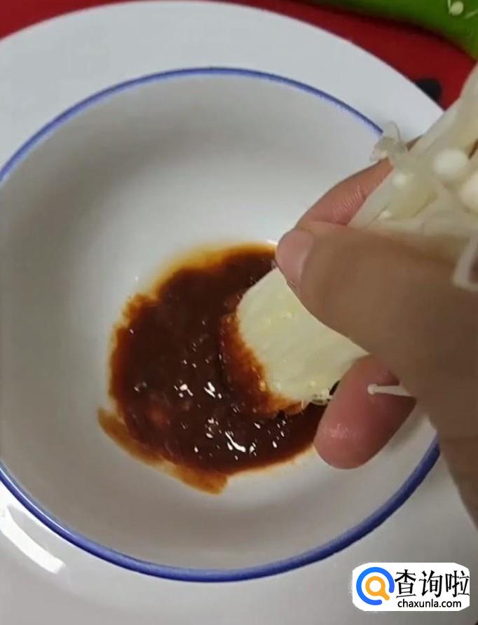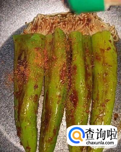 接着,我们把金针菇沾点蒜蓉辣酱,然后塞入青椒中