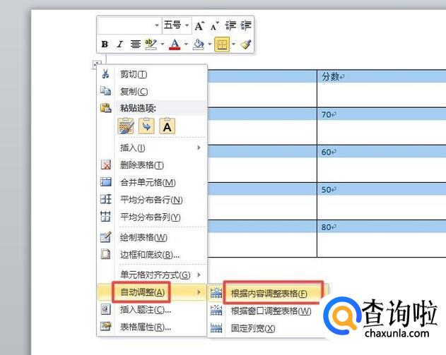 之后我们右击,弹出的界面,我们将鼠标放在自动调整处,弹出的界面,我们点击根据内容调整表格;