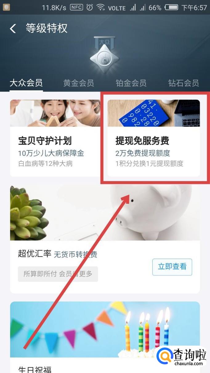 这里是【蚂蚁会员】的【等级特权】,点击界面右侧的【提现免手续费】,如图所示。