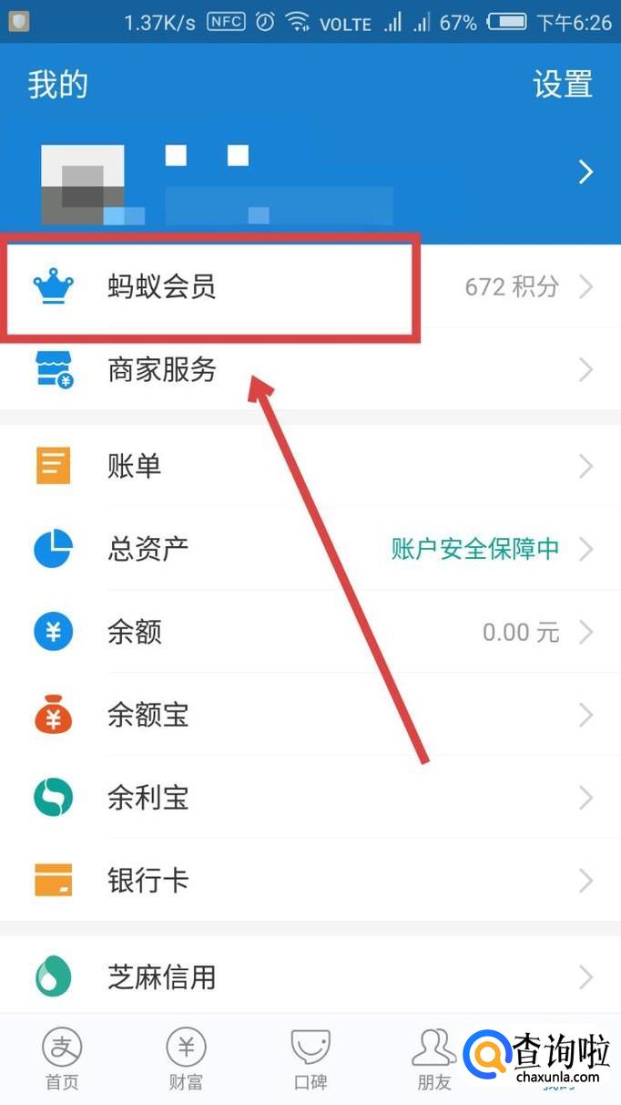然后在界面上方找到【蚂蚁会员】,如图所示,点击进入。