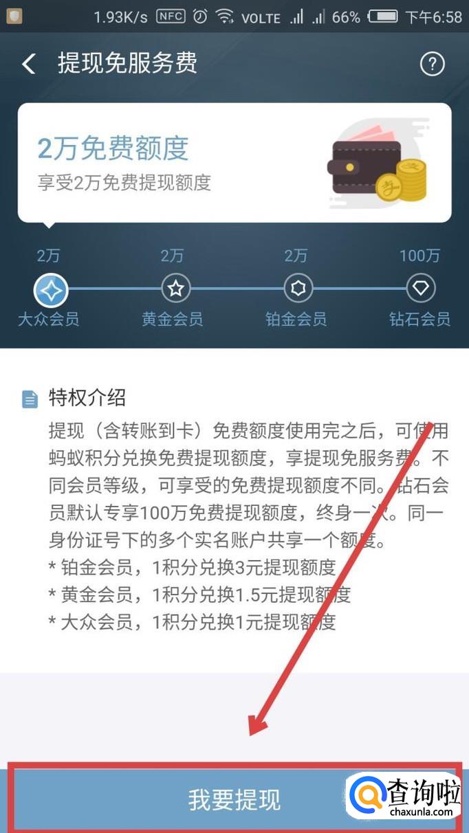 然后点击界面最下方的【我要提现】,点击进入。我们在这里可以用蚂蚁积分兑换免费提现额度,不同的等级额度不同,如图所示。