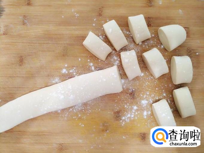 煎饺最好是用死面来做,这样的煎饺吃起来口感会更好。面团揉好之后醒面半小时,然后搓成长条,并且用刀切成一个个的面剂子。