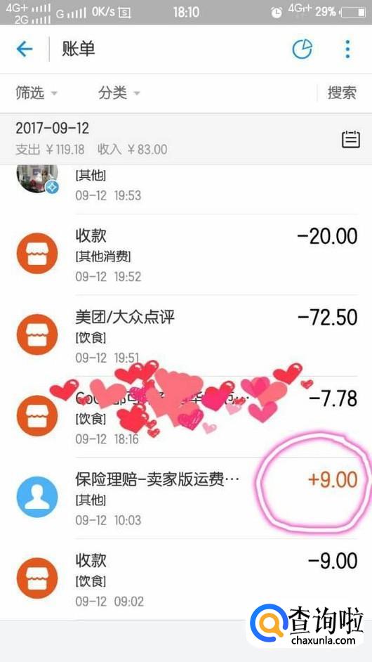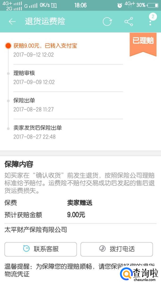 在退货运费险页面我们可以看到理赔情况,如图所示2017年9月12日已获赔9元。