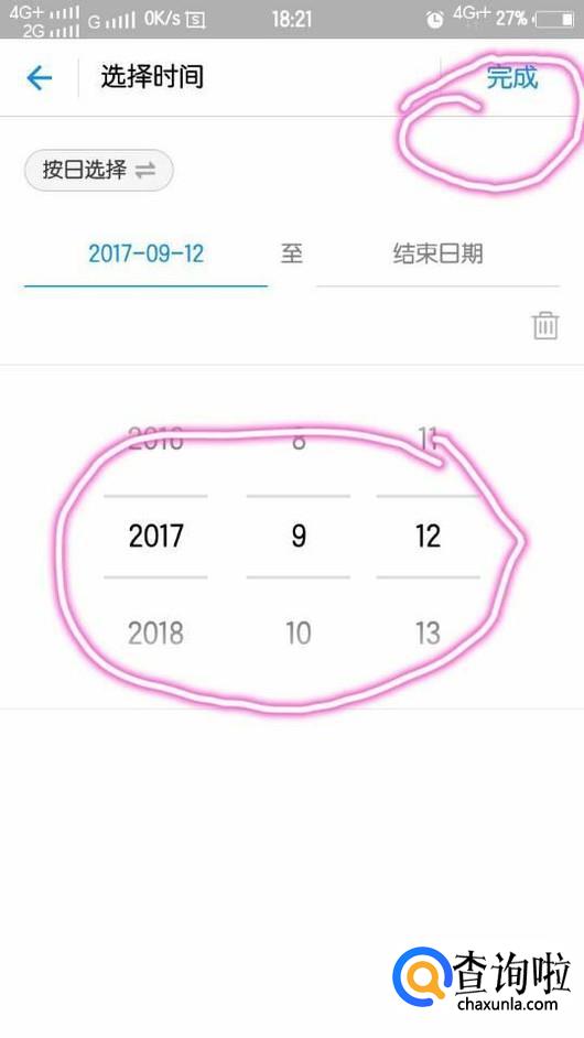 出现“按日选择”,将日期调整至2017年9月12日,点击“完成”。