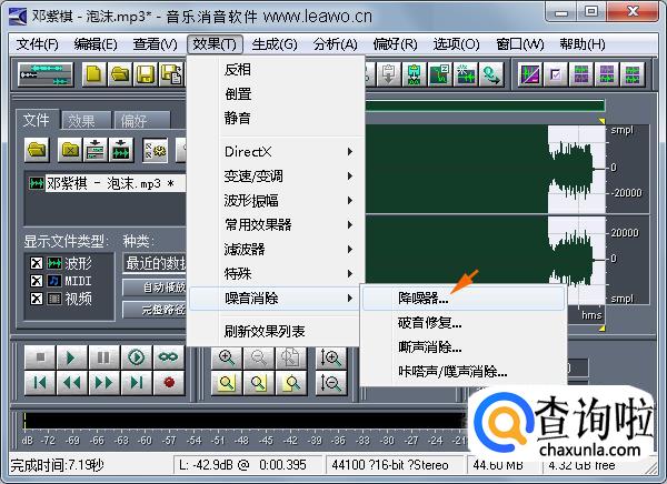 选择歌曲消音软件“效果”菜单下的“噪音消除”-“降噪器...”。
