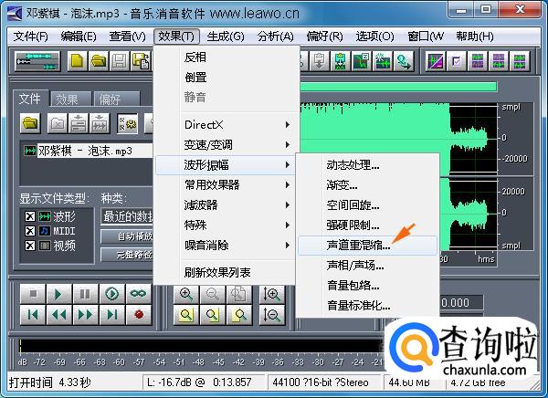 选择“效果”菜单下的“波形振幅”→“声道重混缩...”,进入“声道重混缩”编辑界面。