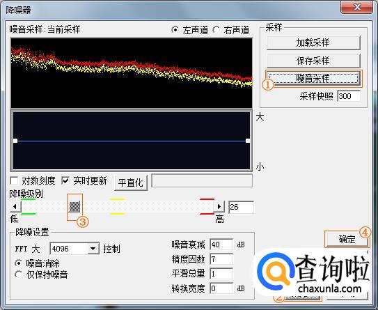 如下图,降噪器窗口。点击“噪音采样”,然后点击“预览”,一边试听声音一边调整“降噪级别”,具体调成怎样,就要靠你的耳朵来判断了。然后点击“确定”保存设置并返回。