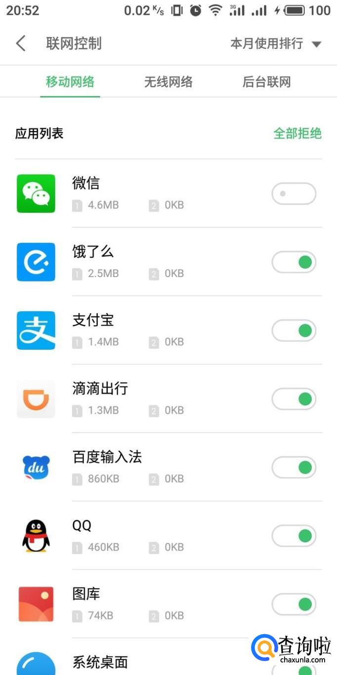 进入联网控制界面,我们能够看到各个应用,右侧滑块开启的时候就表示这个应用能够使用流量。
