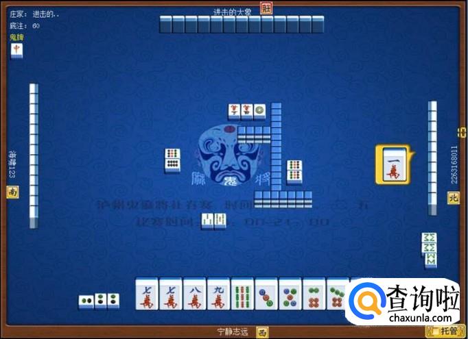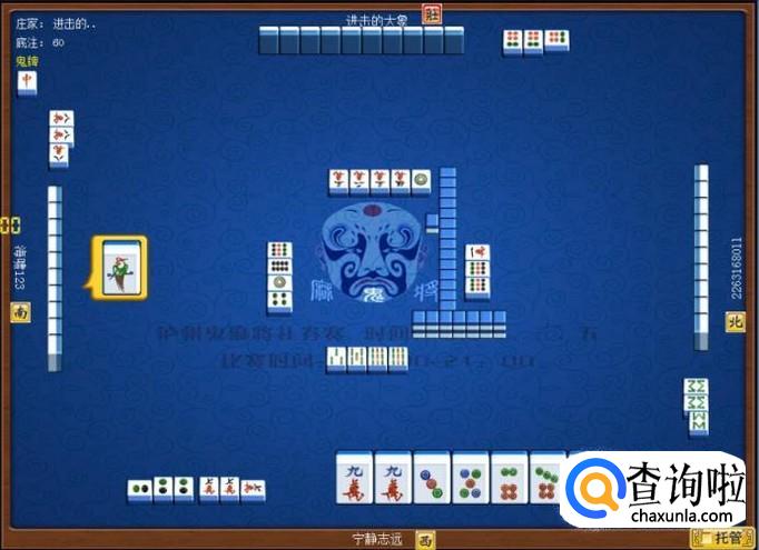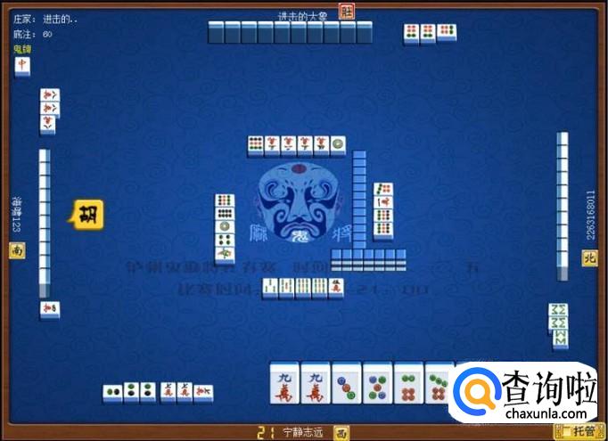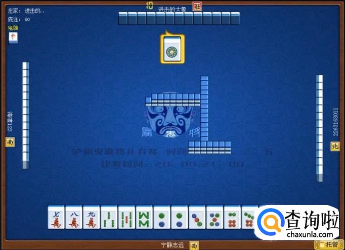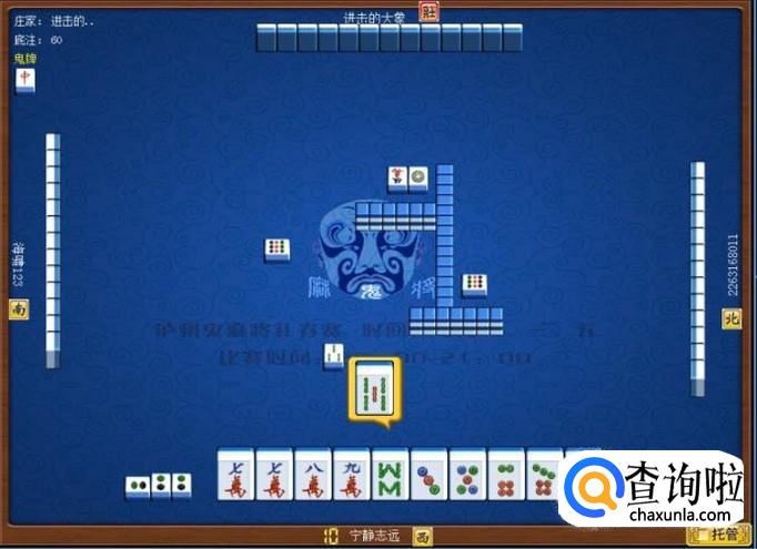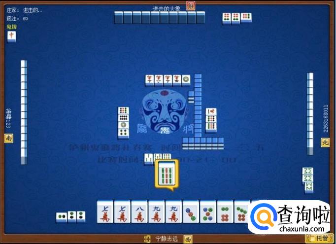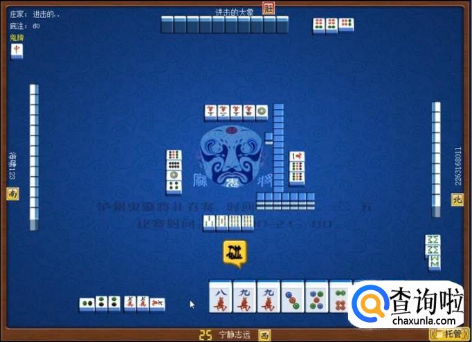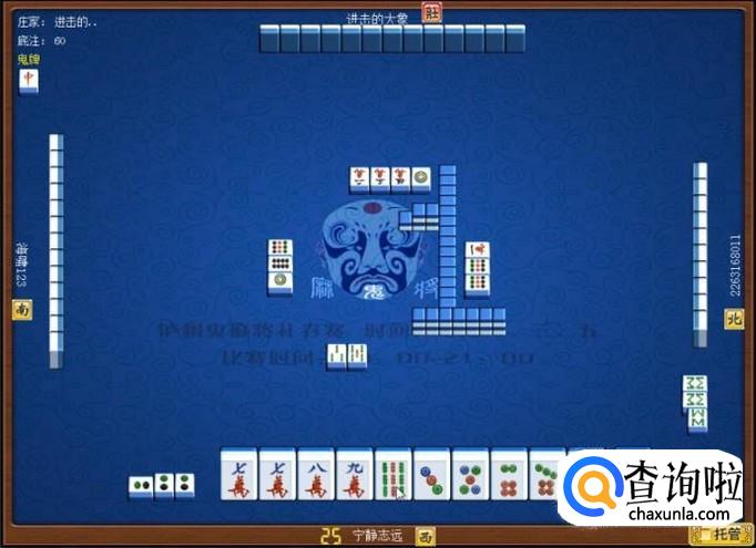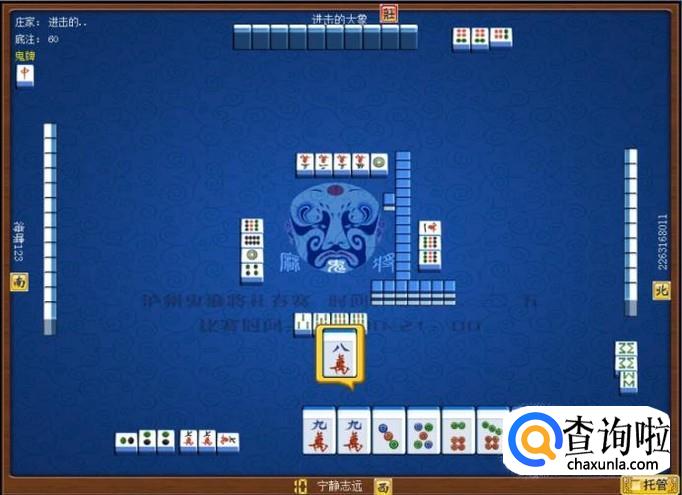 下家摸牌打九筒,庄家摸牌打三万,顶家摸牌打八筒。本家摸牌,摸到九条,本家打八条。如图所示。
