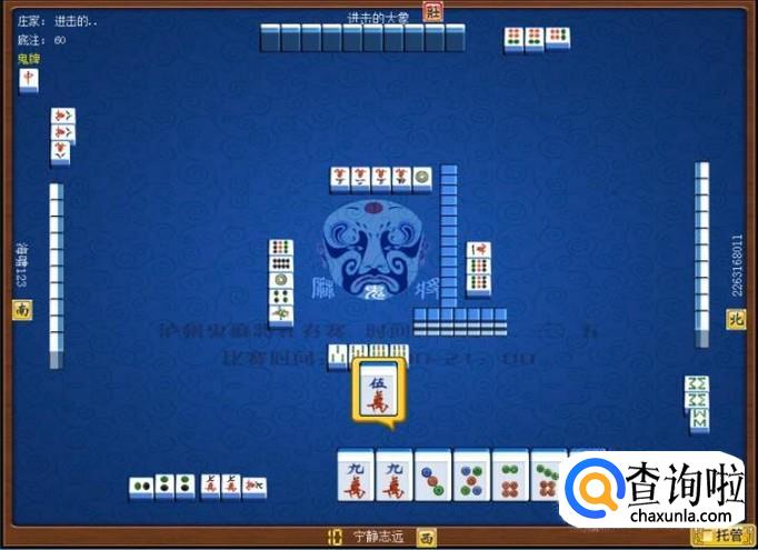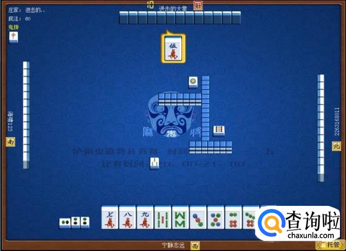 顶家碰八万,打出幺鸡。本家摸牌摸到五万,本家打五万。如图所示。