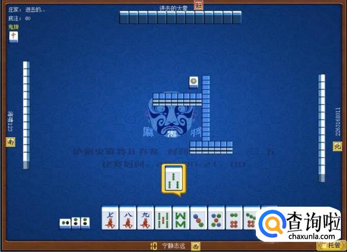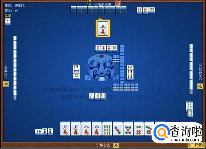 本家手里筒子较多,并且本家有一对二筒。因此,本家碰二筒。本家手里的万字和条子一样多,考虑到万字为一组牌,而条子比较散,于是,本家决定打缺条子。本家打出三条。如图所示。