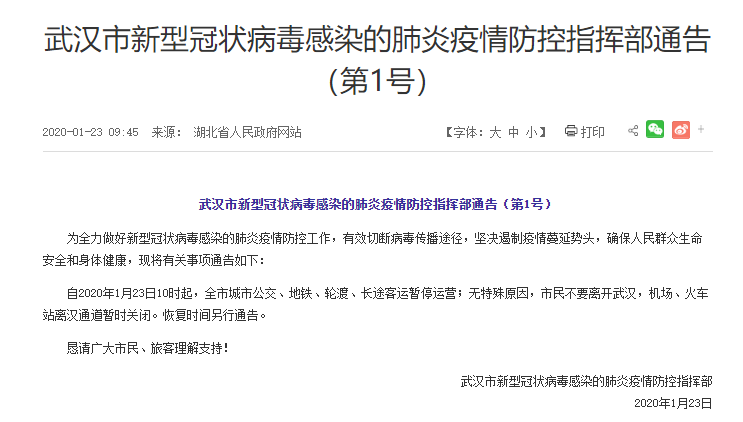 湖北省武汉市新型冠状病毒感染疫情防控指挥部于2020年1月23日发布通告,全市公交、地铁、轮渡、长途客车暂停运营,没有特殊原因市民不能离开武汉,同时机场、火车站离汉通道暂时关闭。恢复时间另行通告。