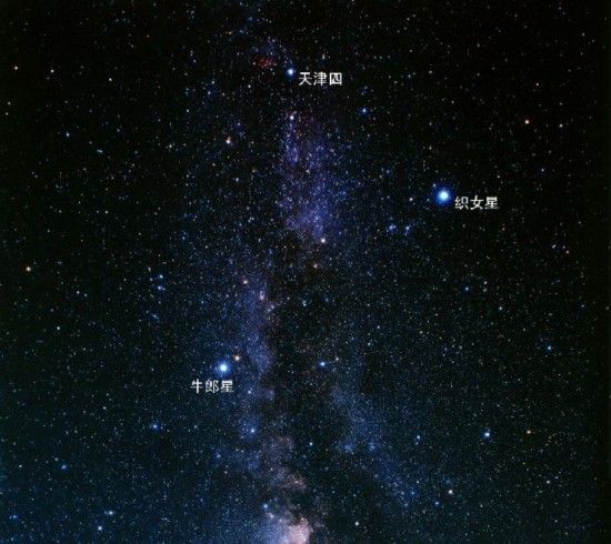 在古代星宿体系中,“牛宿”由6颗星组成,位于银河的东岸,像两个倒置的三角形,一上一下,很有特点,不过上面的那个三角形更大一些,亮一些。而下面的小三角形正好位于黄道上,这几颗星组成了一个头上有两角,却只有三只足的牛,因此古人称其为“牵牛”。这头“牛”的南边有9颗小星,组成了“天田”,是它耕作的地方,再向南看,在接近南方地平线的地方,是“九坎”9星,坎是蓄水的低地,用于灌溉农田。牛宿的东面紧挨着的是“罗堰”3星,是类似水库的水利设施。“织女”3星位于牛宿的北部,其中的“织女一”星是全天第五亮星,仅次于“大角”星,因此又常直接称为“织女星”。古人将“牛宿星”与“织女星”合称为牛郎织女。