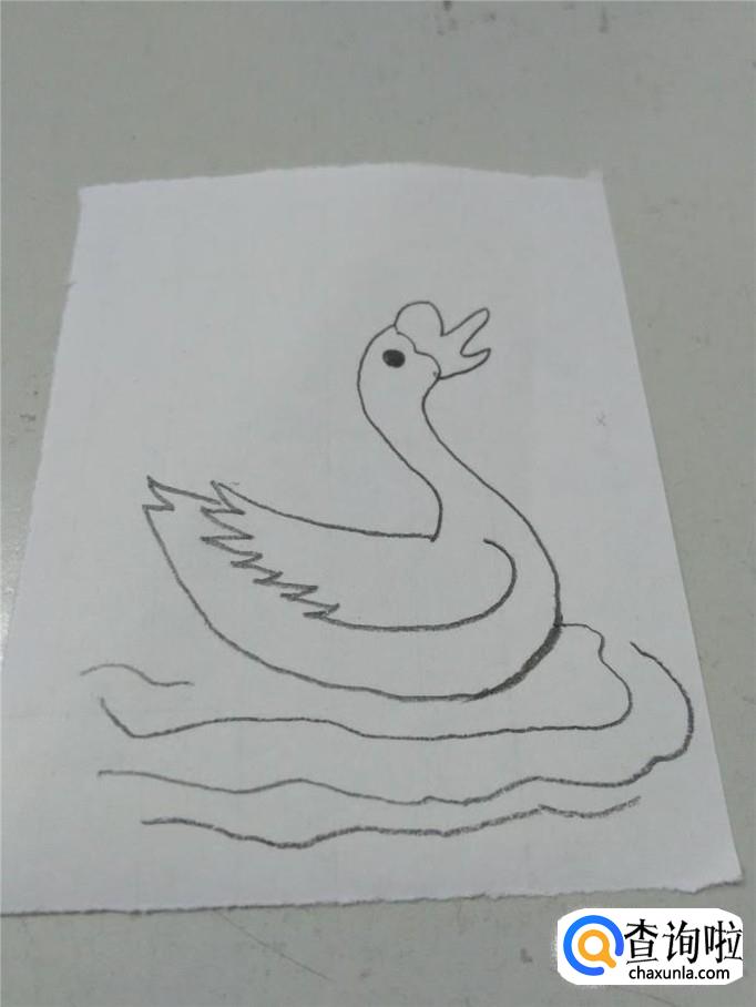 从左边的小S末端往左先画一条横线,然后向右下方画一些锯齿形状,表示羽毛,然后在脖子下面拐个弯,这个锯齿形的部分是鹅的翅膀。