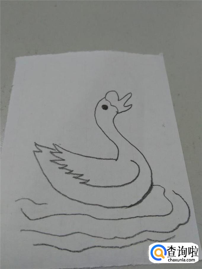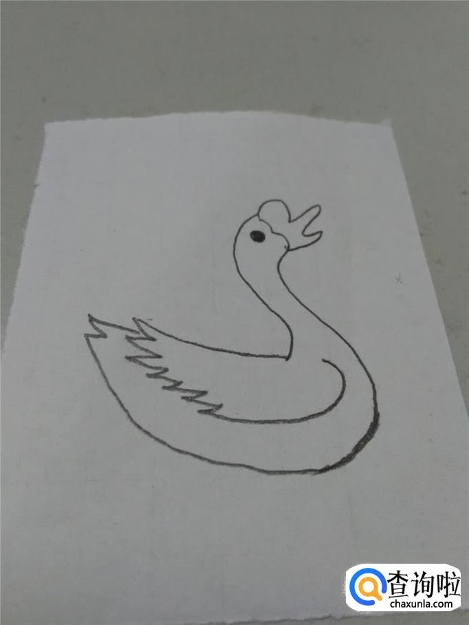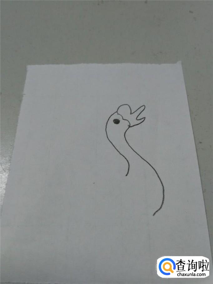 从鹅头顶往下画一个长长的S形,从下片嘴往下,再画一个更长的S形,两个S形之间组成了鹅长长的脖子,在鹅头上,再画一个黑点,表示眼睛。