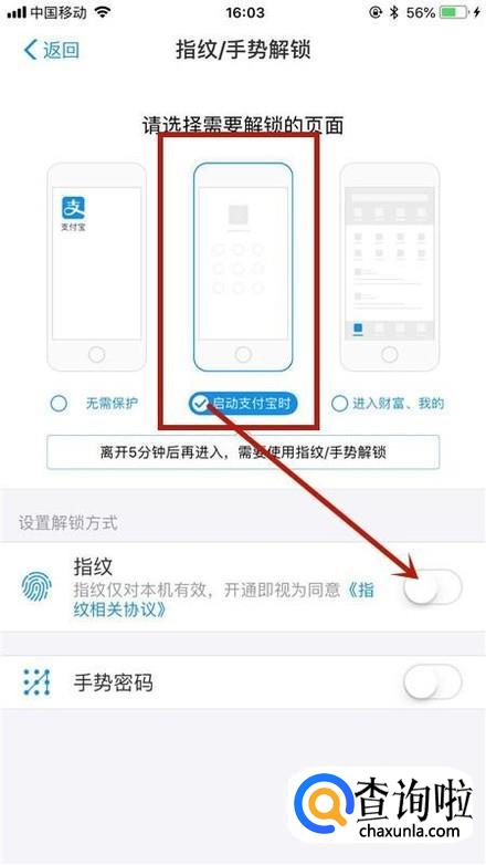 最后选择启动支付宝时,并点击开启指纹开关就可以了。