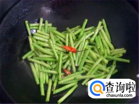 锅里面倒入适当的植物油,烧至五六成热的时候放入大蒜末,然后把豇豆放进去翻炒,加入调味料,记得适当加点水别糊锅。炒熟之后,放上红辣椒翻炒几下出锅。