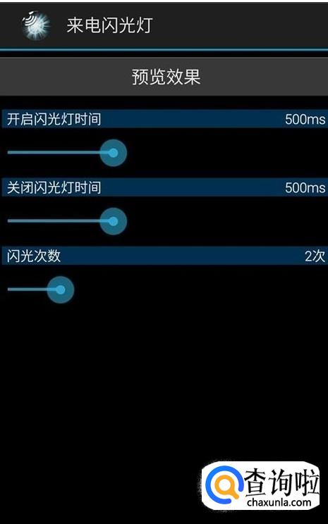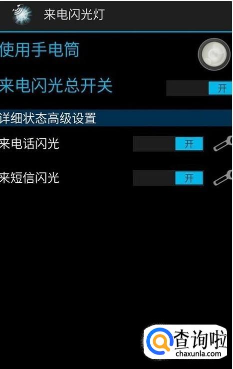 下载安装好后,打开发现有四个按钮,分别是手电筒开关、闪光提醒总开关、来电闪光开关和短信闪光开关四个选项。