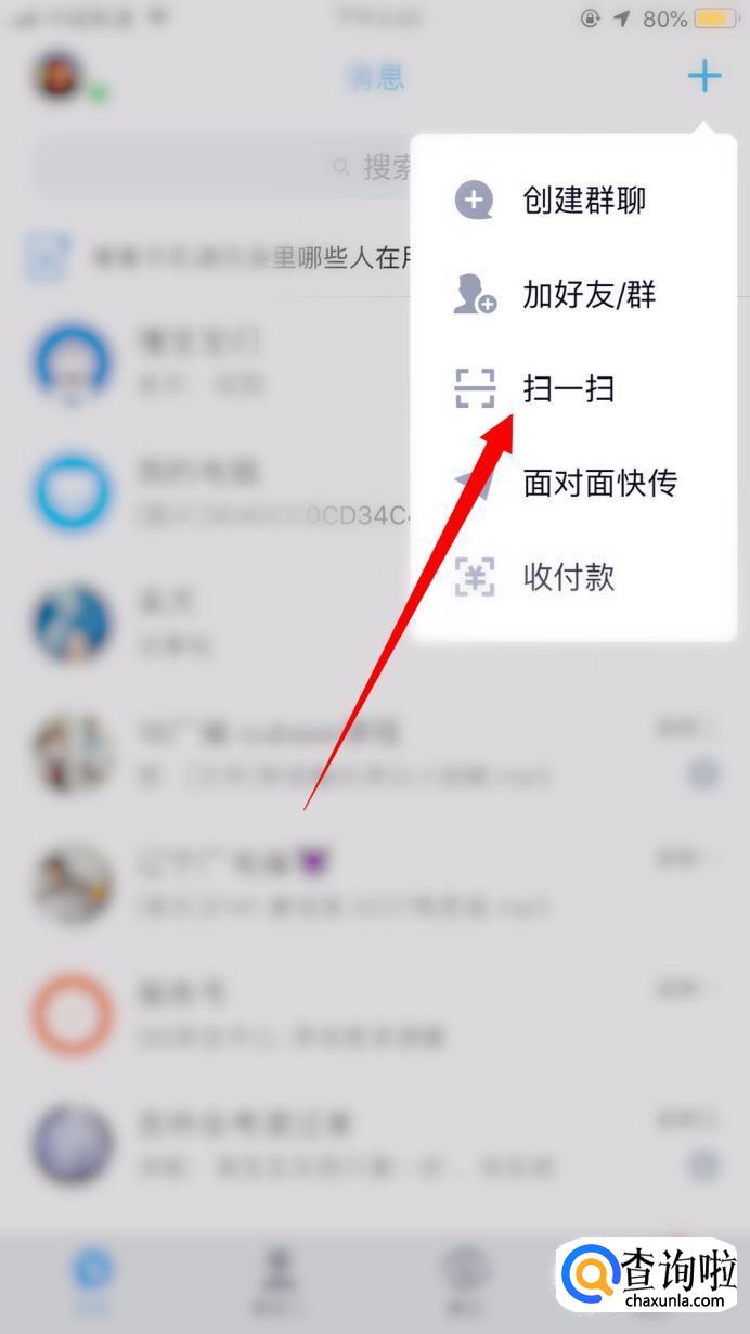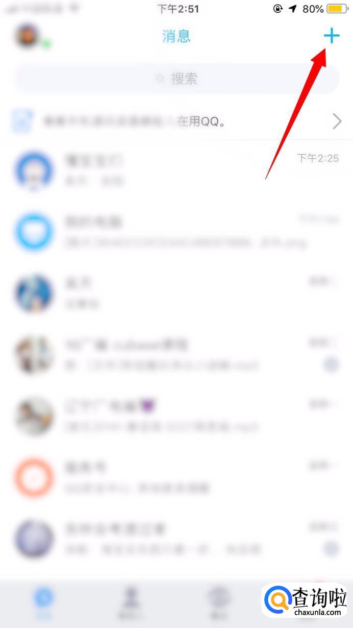 打开手机QQ,进入消息界面,点击右上角的加号。