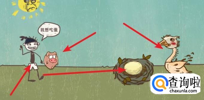 第15关,我们先点击小猪,把母鸡身上的毛吹掉,再点击人就可以去拿鸡蛋了。