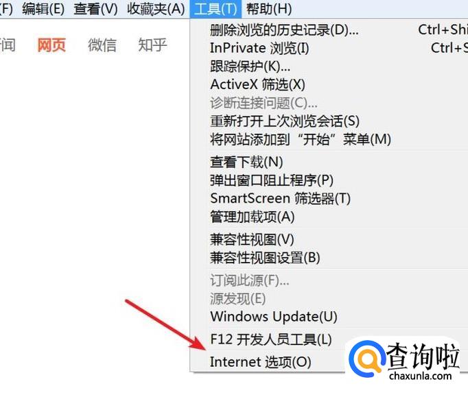 打开IE浏览器,点击‘工具’菜单下的‘Internet选项’