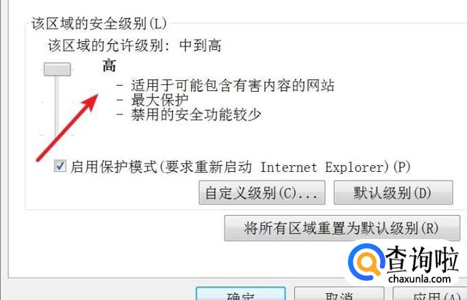 在安全项下,可看到安全级别被设置成了‘高’,这就是导致问题的原因。