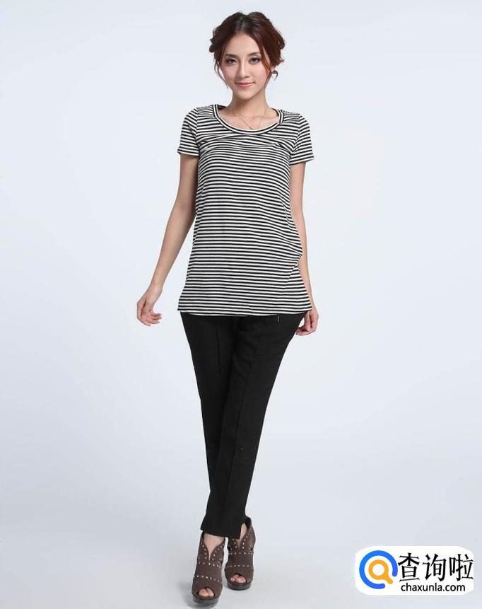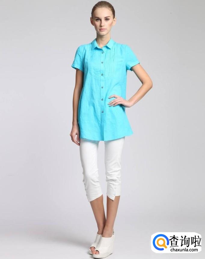 长款短袖上衣不宜搭配宽松的裤子,搭配紧身九分裤既不显矮,也不显胖,相反给人干练的感觉。