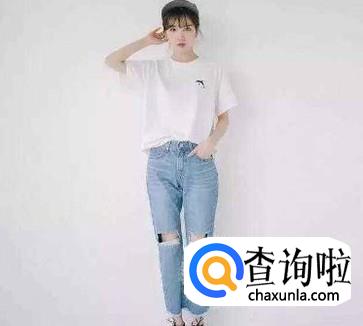 长款短袖上衣搭配破洞牛仔裤,将上衣衣摆插进牛仔裤里,给人一种不羁的感觉,酷酷的,适合高冷的女性。