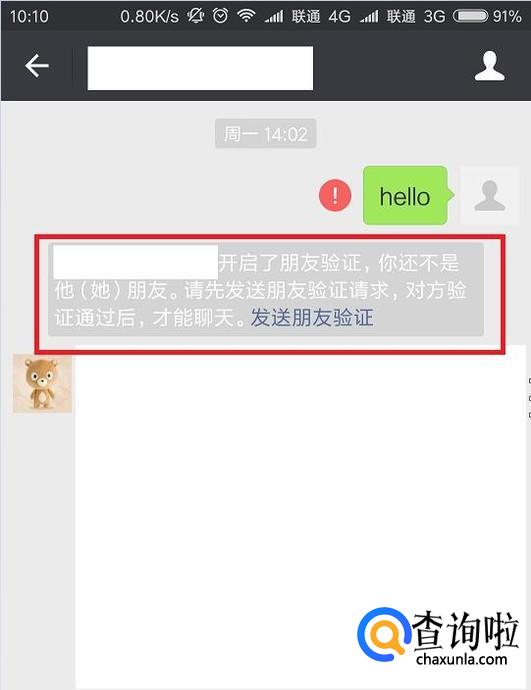 给好友发送一个问候信息,查看消息是否被成功发送,如果系统提示我们对方不是我们的好友,那么证明对方已经将你删除了。