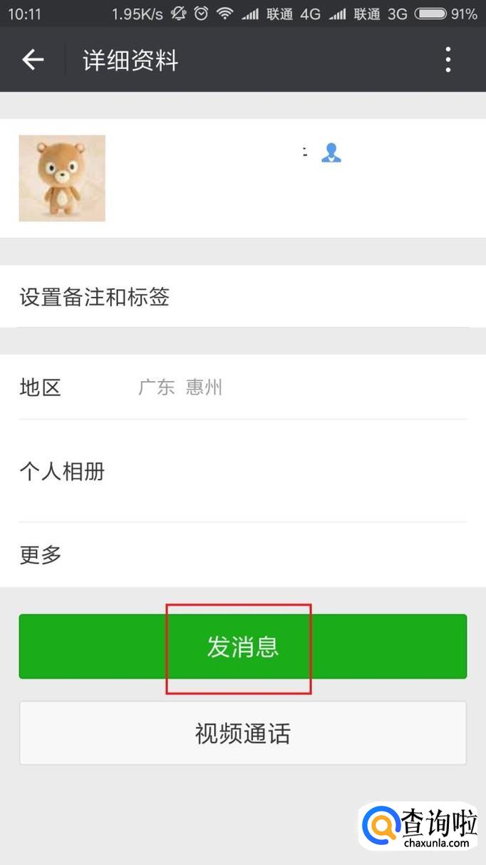 打开好友个人页面之后,点击“发消息”选项,进入聊天页面。