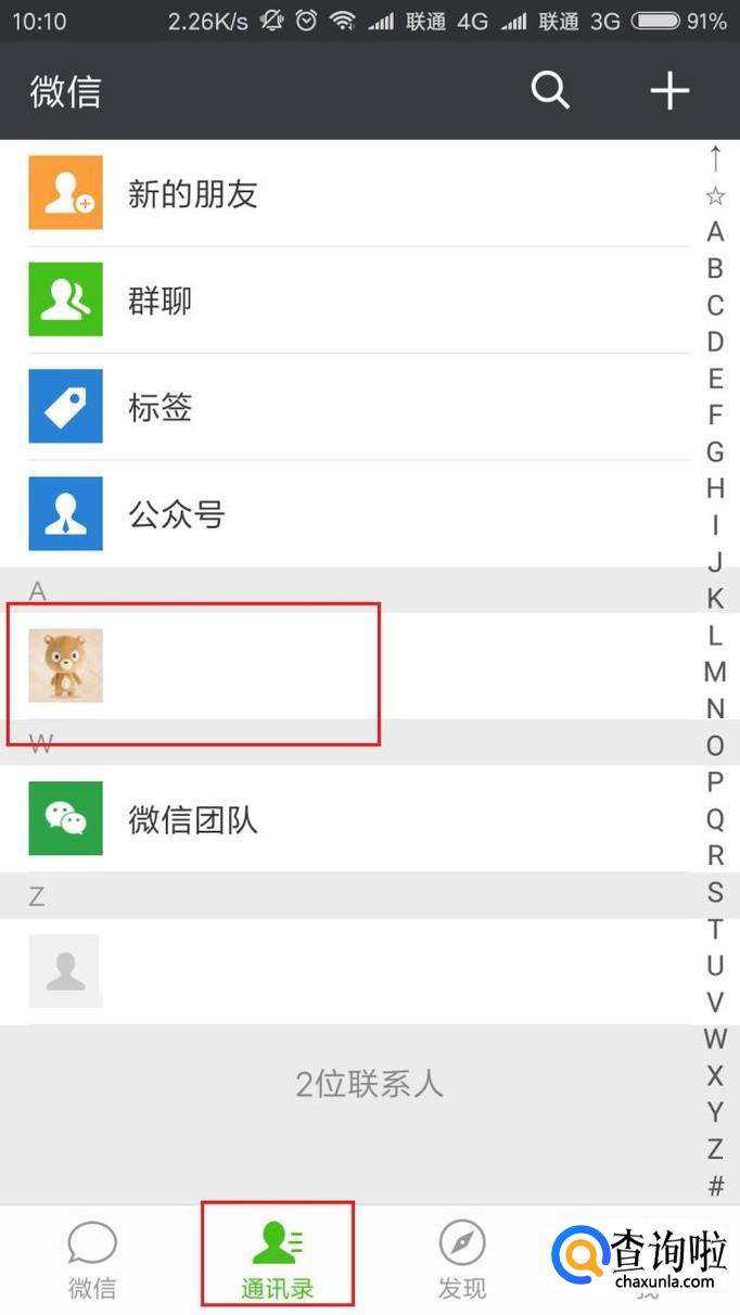 首先,请大家打开微信客户端APP,在微信应用主页面中点击“通讯录”菜单,并点击选择要测试的好友。