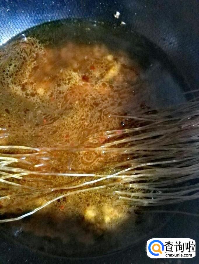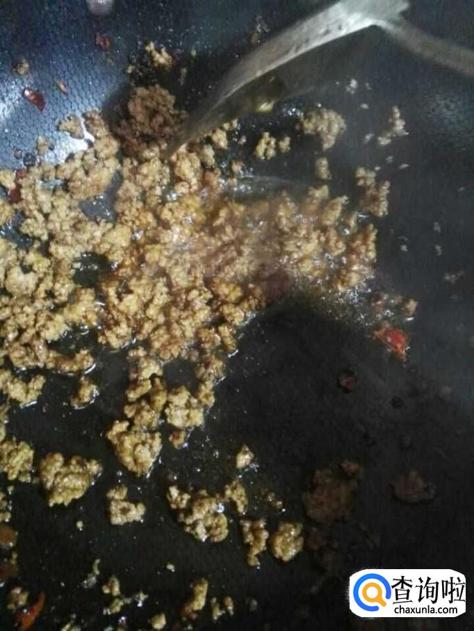 豆瓣爆香后倒入猪肉,适当翻炒后加入适量食盐和酱油。