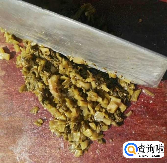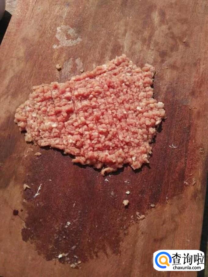 将猪肉、酸菜切片开剁,剁成颗粒状。