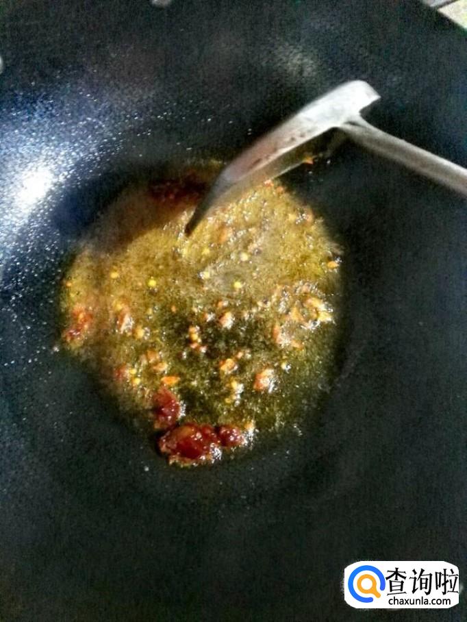 往锅内倒入适量食用油(猪油、清油混合味道极佳),加入郫县豆瓣适当翻炒。