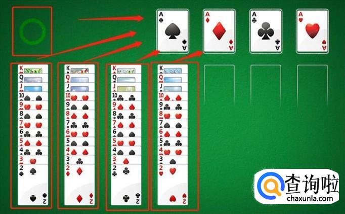 简单一点来说,大家需要将下方的几叠纸牌和左上角的一叠纸牌,全都移动到右上角的框框里。