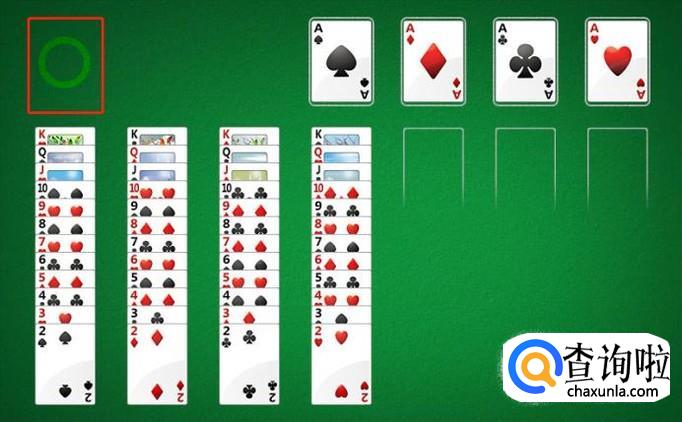 右上角是所有纸牌的归属地,大家的任务也就是将所有的纸牌都移动到4个框框中,但右上角4个框框,只能首先放入四种花色的A,最后是K。