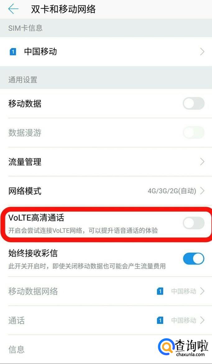 有的手机VOLTE高清通话开通按钮在SIM卡的位置设置。