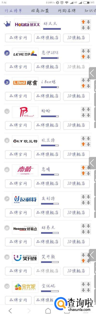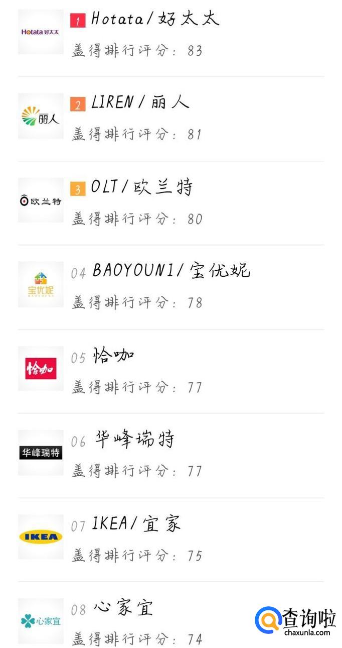 其他方式的排名。依次为好太太、丽人、欧兰特、宝优妮、恰佳、华峰瑞特、宜家、心家宜。
